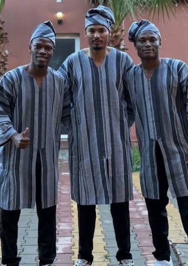O Mali apresenta trajes em tons de azul profundo, associados diretamente ao bogolan (bogolanfini) tecido tradicional tingido com lama fermentada, símbolo de proteção, espiritualidade e conhecimento ancestral.