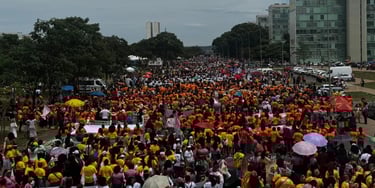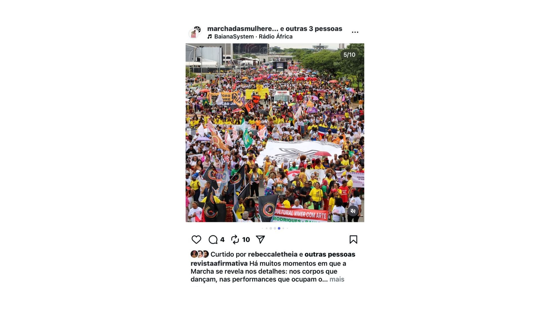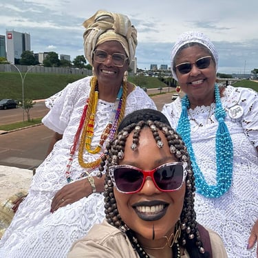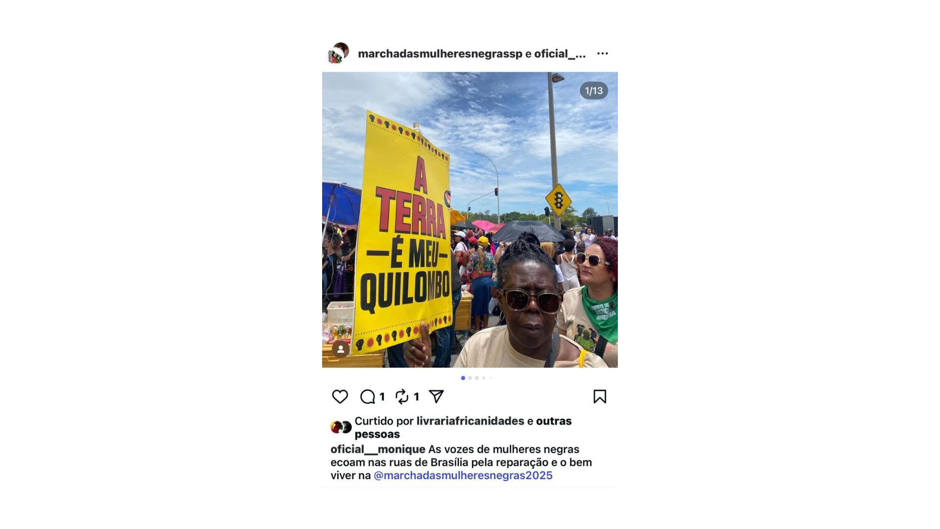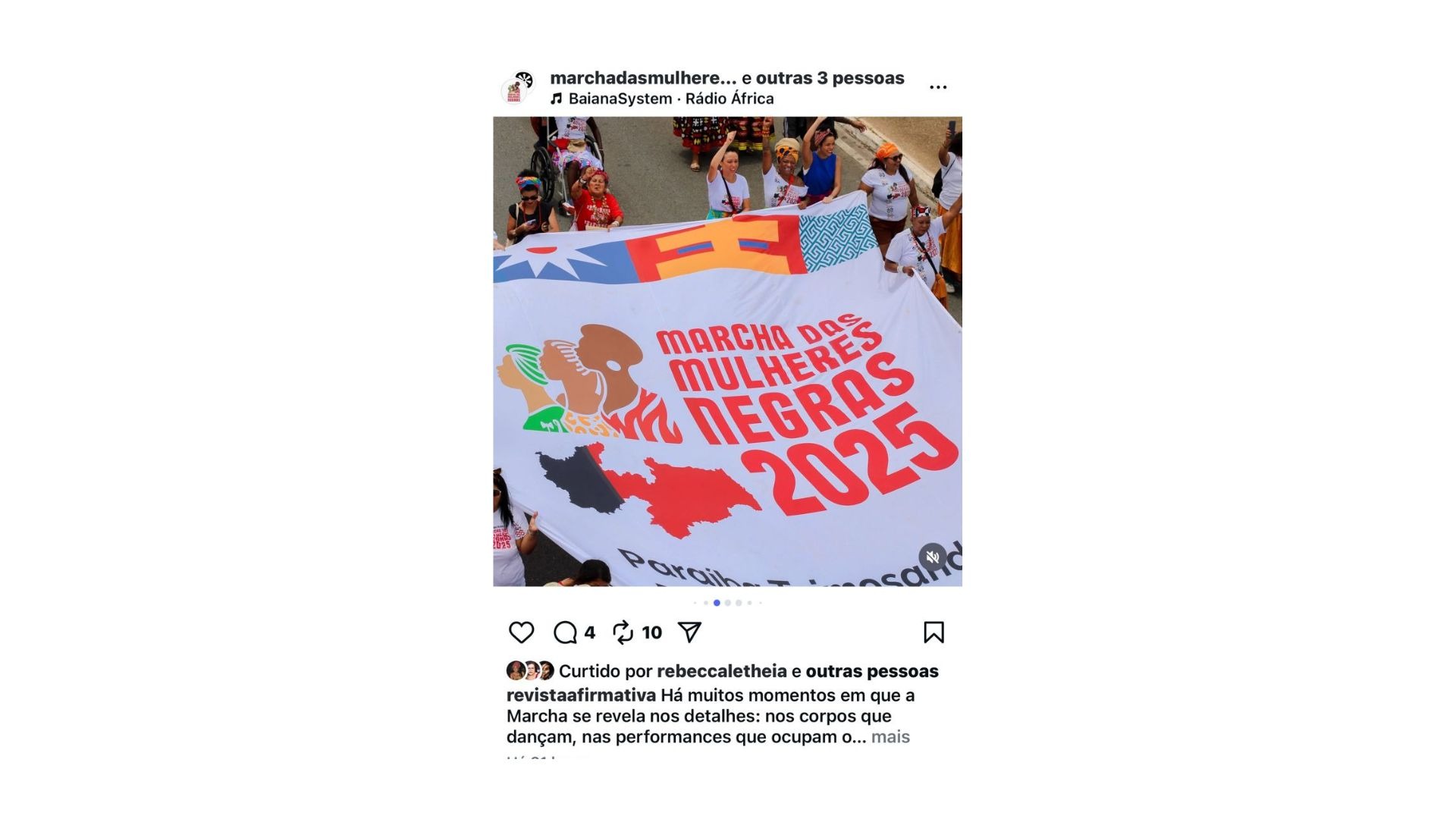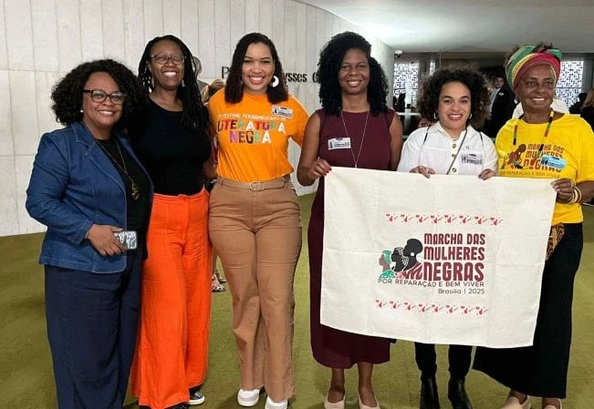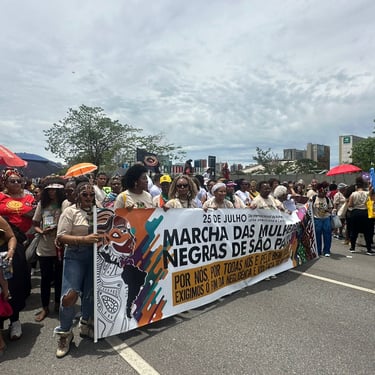 Marcho por todas as mulheres negras católicas, evangélicas, de matriz africana, jovens, adultas, mais velhas, artistas, trabalhadoras, estudantes, cuidadoras — por todas que seguram o mundo e constroem esse país todos os dias.