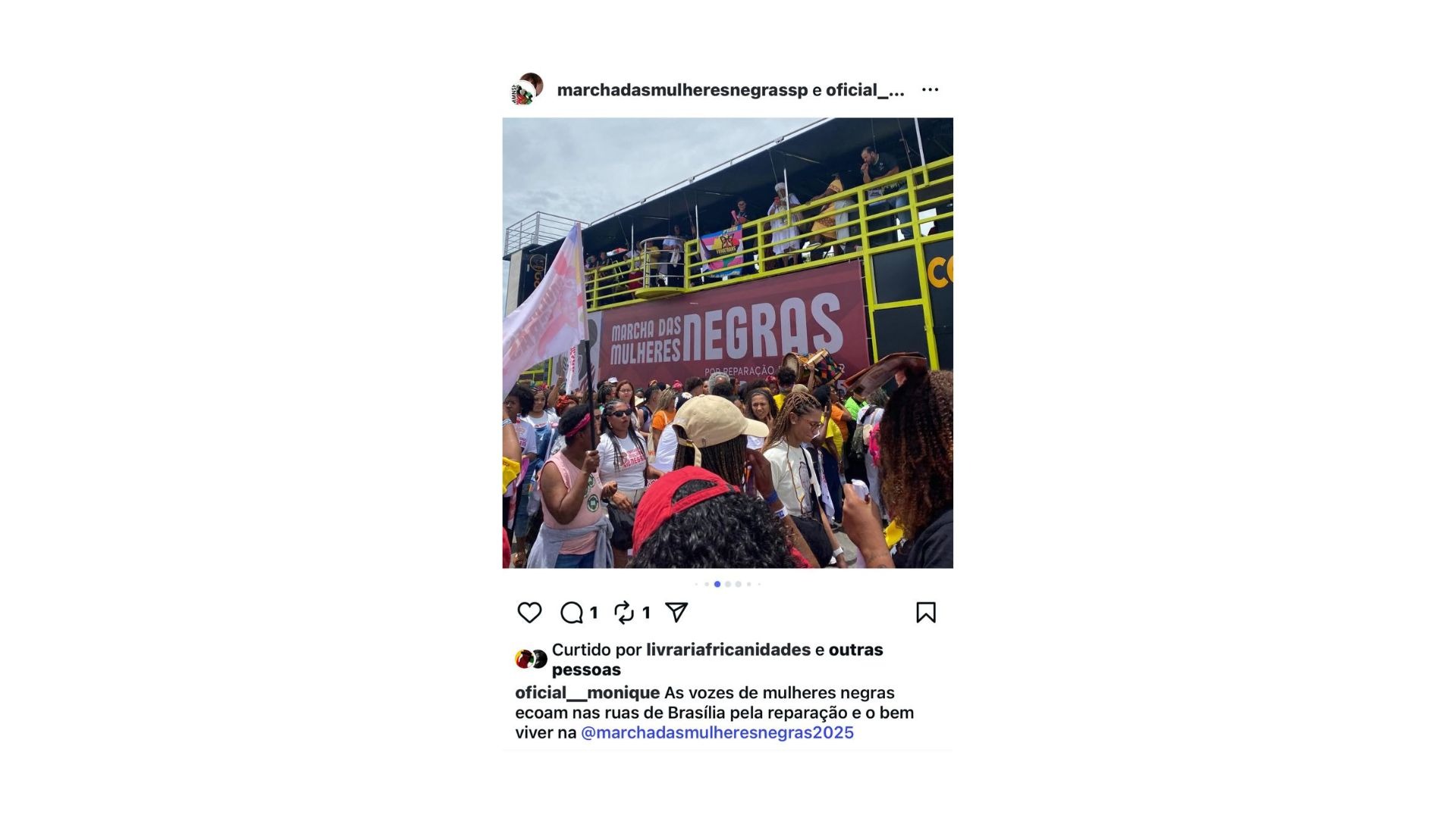 Agradeço a todas as mulheres negras que somaram, presencialmente ou virtualmente, fortalecendo a Marcha de onde estavam. Porque a marcha é coletiva,