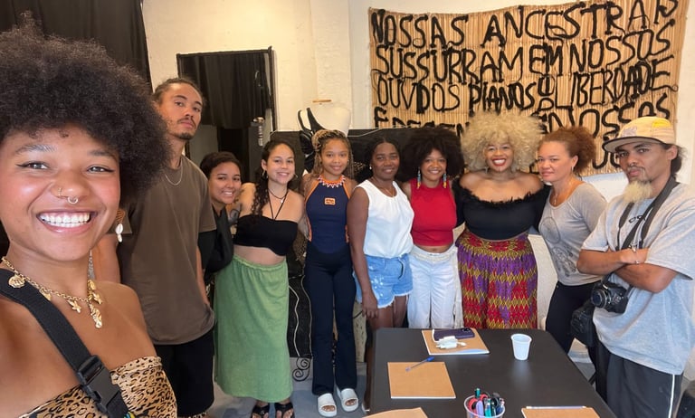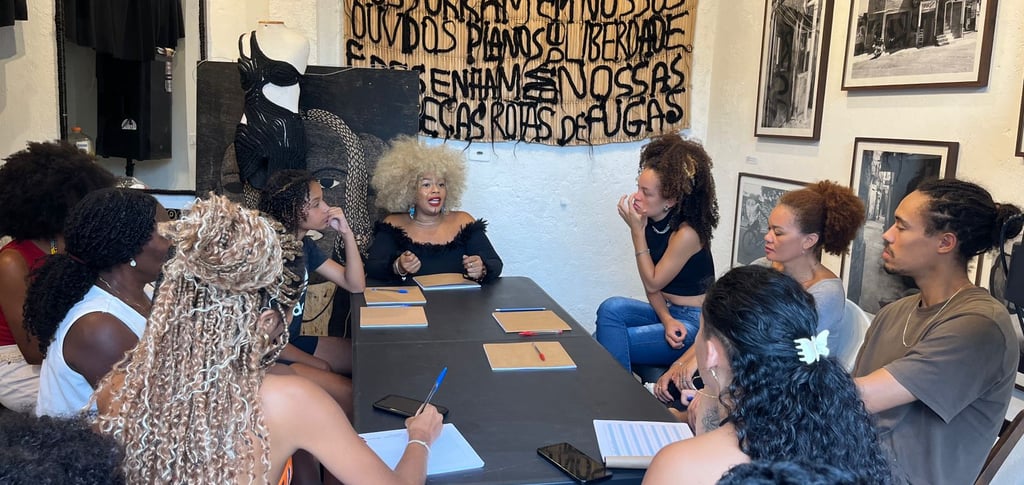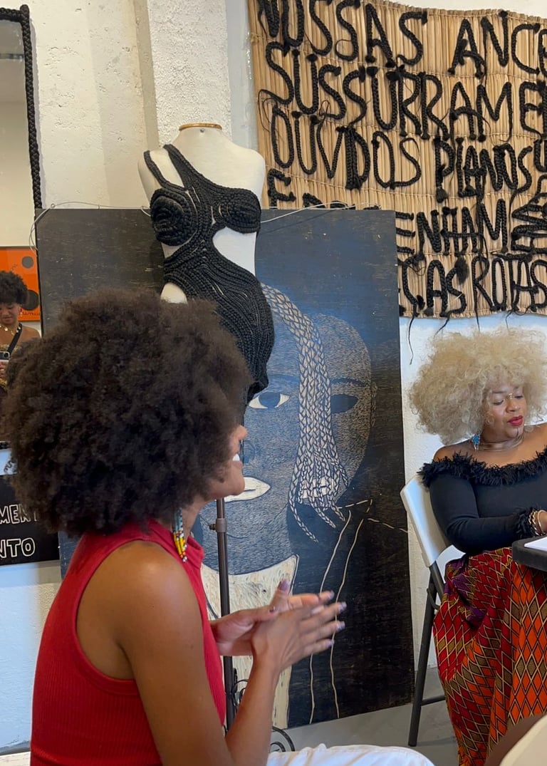 Desde o primeiro encontro, estamos trabalhando de forma transversal a construção do imaginário capilar, entendendo imaginário como o conjunto de imagens, memórias, narrativas e referências que moldam a forma como nos vemos, cuidamos e apresentamos nossos cabelos no mundo. Cada aula articula escuta, partilha, reflexão e prática, acessando memórias pessoais e coletivas e reconhecendo o legado das trançadeiras como tecnologia viva de cuidado, resistência e continuidade cultural.